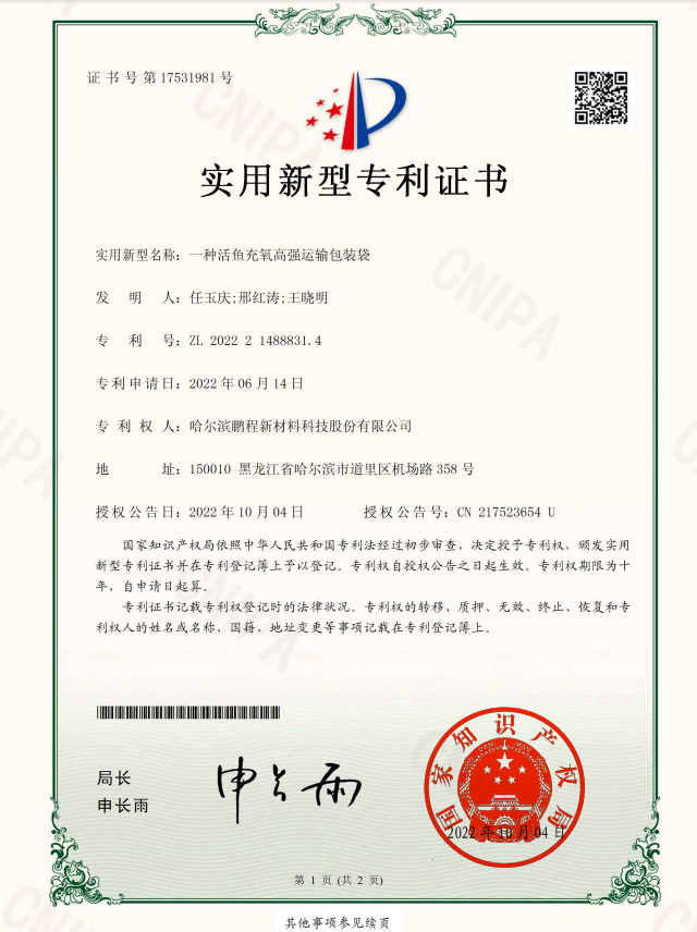 實(shí)用新型名稱:一種活魚充氧高強(qiáng)運(yùn)輸包裝袋